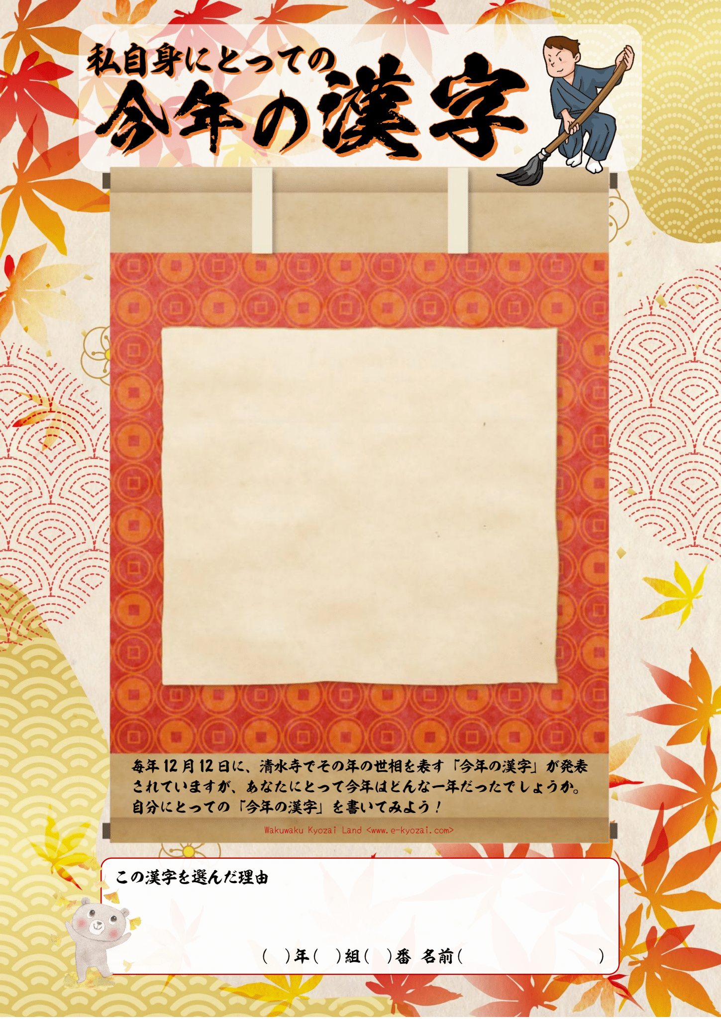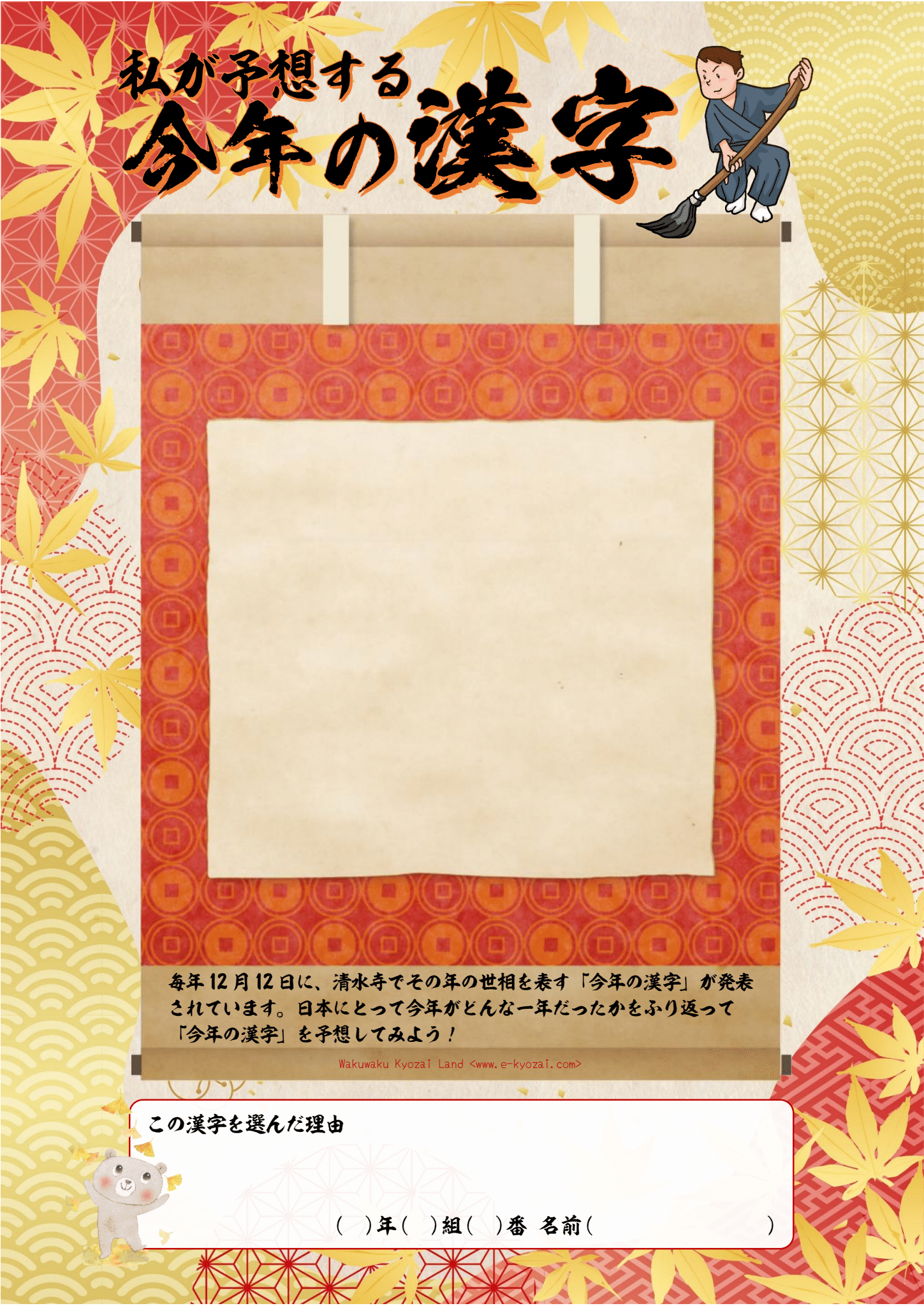 日本全国の公募で最も多かった漢字がその年の世相を象徴する漢字となることを踏まえ、生徒自身が一年を振り返り、12月12日に清水寺で発表される「今年の漢字」を予想させる小活動はいかがでしょうか。