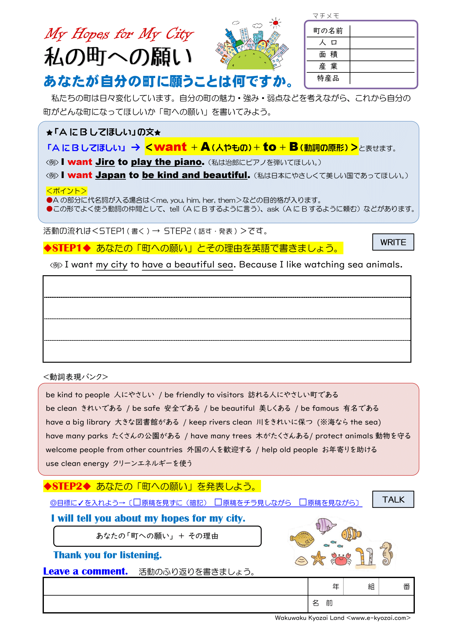 中3向け、<want+A人+to+B動詞の原形>の構文で「自分の町に対する願い」を表現して、互いに交流する活動です。